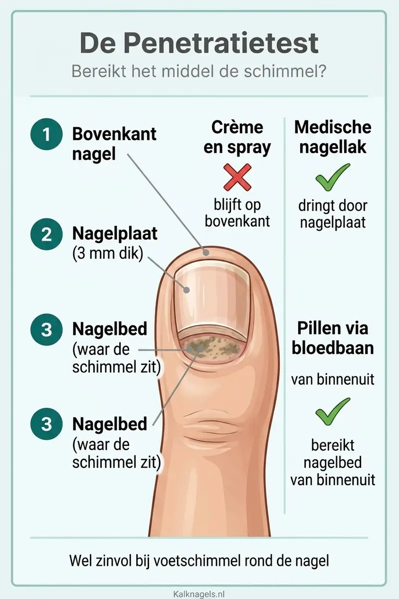 Apotheek.nl bevestigt dit en voegt eraan toe dat crèmes wel geschikt zijn voor huidschimmel rondom de nagel (Bron: Apotheek.nl, 2026). Huidarts.com legt uit dat de nagelstructuur crèmes blokkeert en dat penetratie door de nagelplaat alleen lukt met speciaal ontwikkelde formuleringen (Bron: Huidarts.com, 2026).