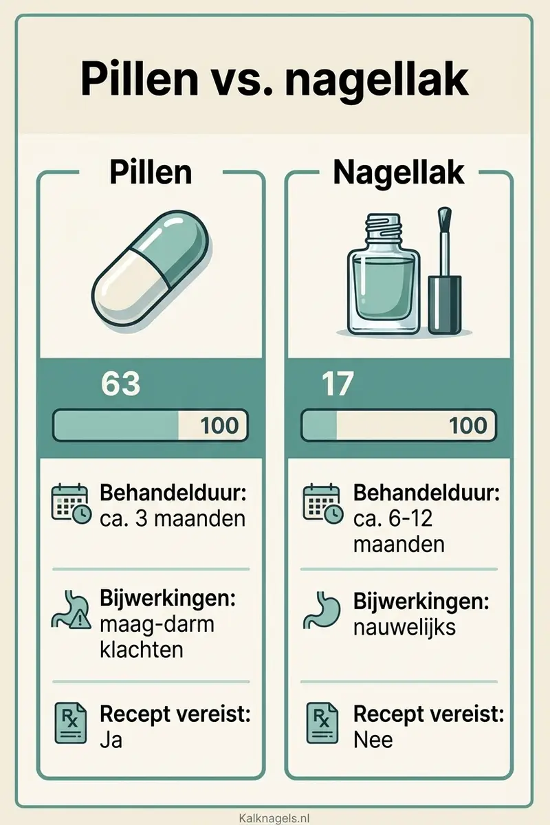 De cijfers spreken voor zich: pillen zijn 3-4 keer effectiever dan nagellak. De afweging is effectiviteit (pillen) vs. bijwerkingsrisico (nagellak). De huisarts helpt je die afweging maken op basis van je situatie.