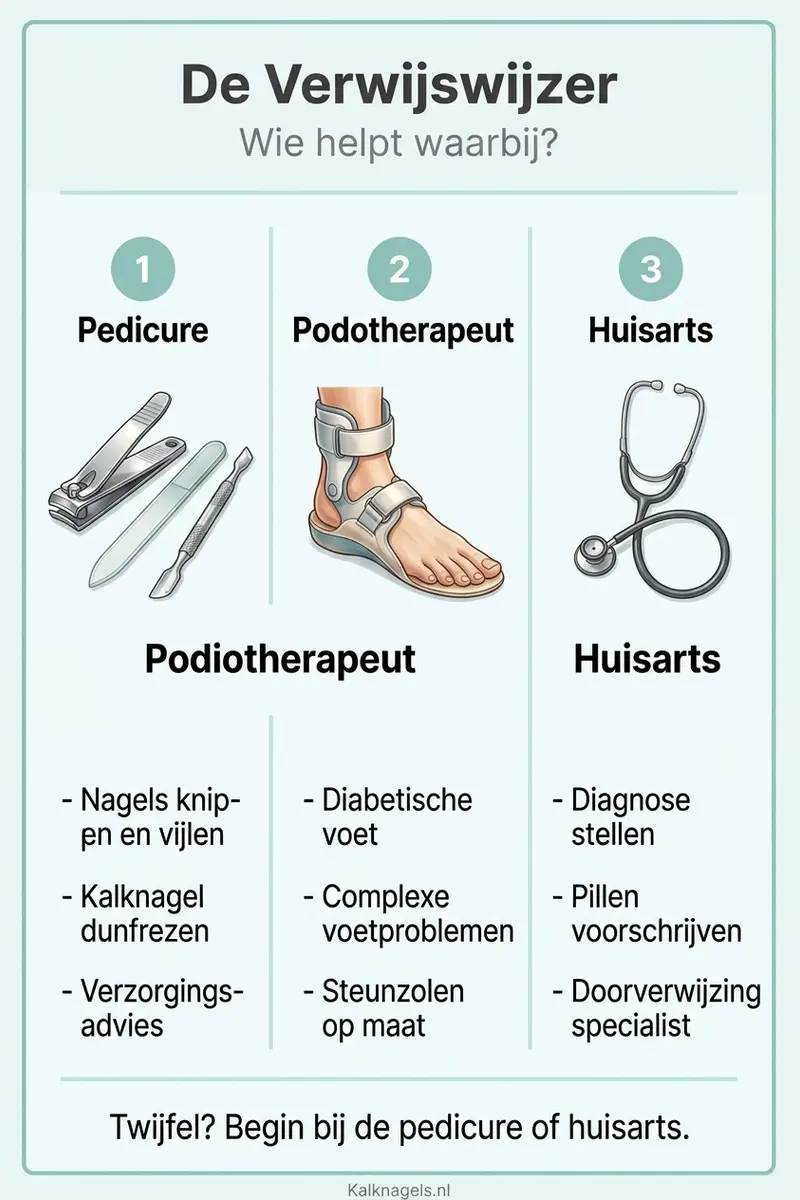 Kalknagel: ga je naar de pedicure, podotherapeut of huisarts? Lees per situatie welke professional het beste past en wanneer een doorverwijzing nodig is.