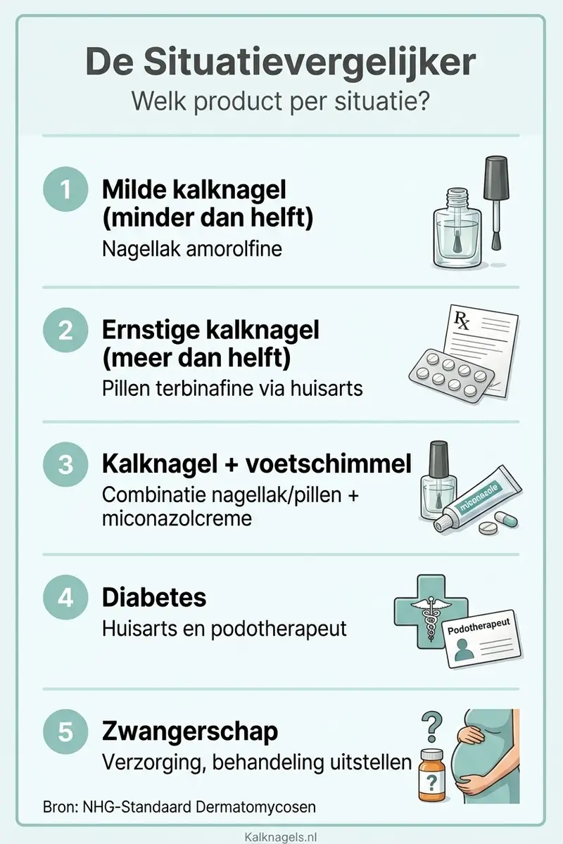 Je zoekt het beste product tegen kalknagels. De eerlijke waarheid: dat product bestaat niet. Welk product het meest geschikt is, hangt af van de ernst van je infectie, je gezondheid en je voorkeuren. Volgens de NHG-Standaard zijn er twee bewezen behandelvormen, maar geen van beide werkt bij iedereen (Bron: NHG, 2026). In dit overzicht vergelijken we producten per situatie, zodat je het middel vindt dat bij jou past.