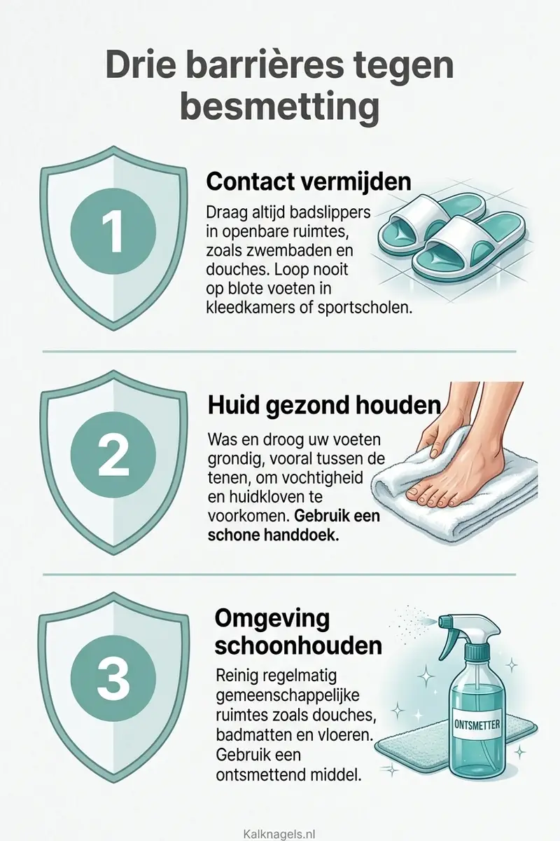 Kalknagels zijn besmettelijk, maar de overdracht is voorspelbaar en grotendeels te voorkomen. De Besmettingsroute verloopt via huidschilfers op oppervlakken, niet via de lucht of casual contact. Drie barrières beschermen je: contact vermijden (slippers), huid gezond houden (droge voeten) en omgeving schoonhouden (badmatten, schoenen).