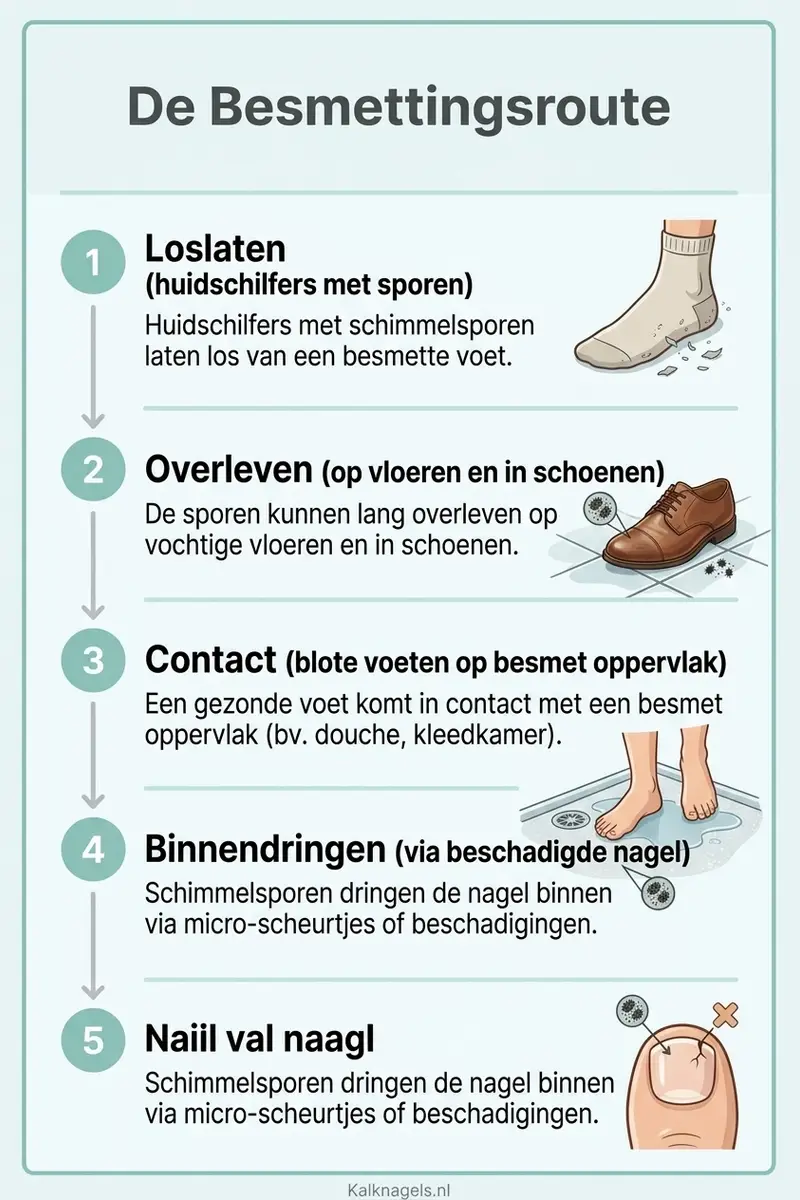 De schimmels die kalknagels veroorzaken, dermatofyten, leven van keratine, het eiwit in nagels en huid. Ze produceren microscopisch kleine sporen die meereizen in huidschilfers. Elke dag verlies je duizenden huidschilfers van je voeten, op de vloer, in je schoenen, op je sokken. Als die schilfers schimmelsporen bevatten, kunnen ze een nieuwe infectie starten bij iemand anders of bij jezelf op een andere nagel.