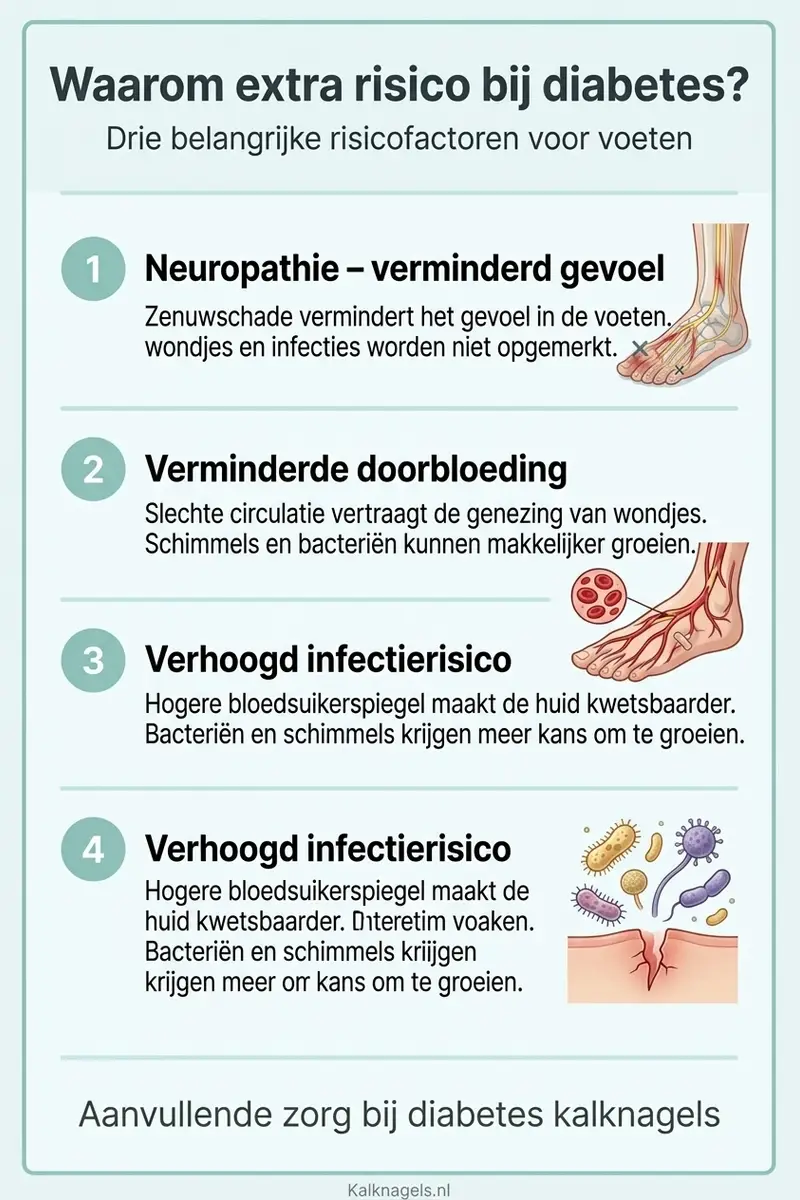 Diabetische neuropathie, zenuwschade door langdurig verhoogde bloedsuikers, vermindert het gevoel in de voeten. Je merkt niet altijd dat je nagel tegen je schoen drukt, dat er een wondje ontstaat door een scherpe nagelrand, of dat je te diep vijlt. Vergelijk het met autorijden zonder tast in je handen: je kunt het stuur niet voelen en reageert te laat.