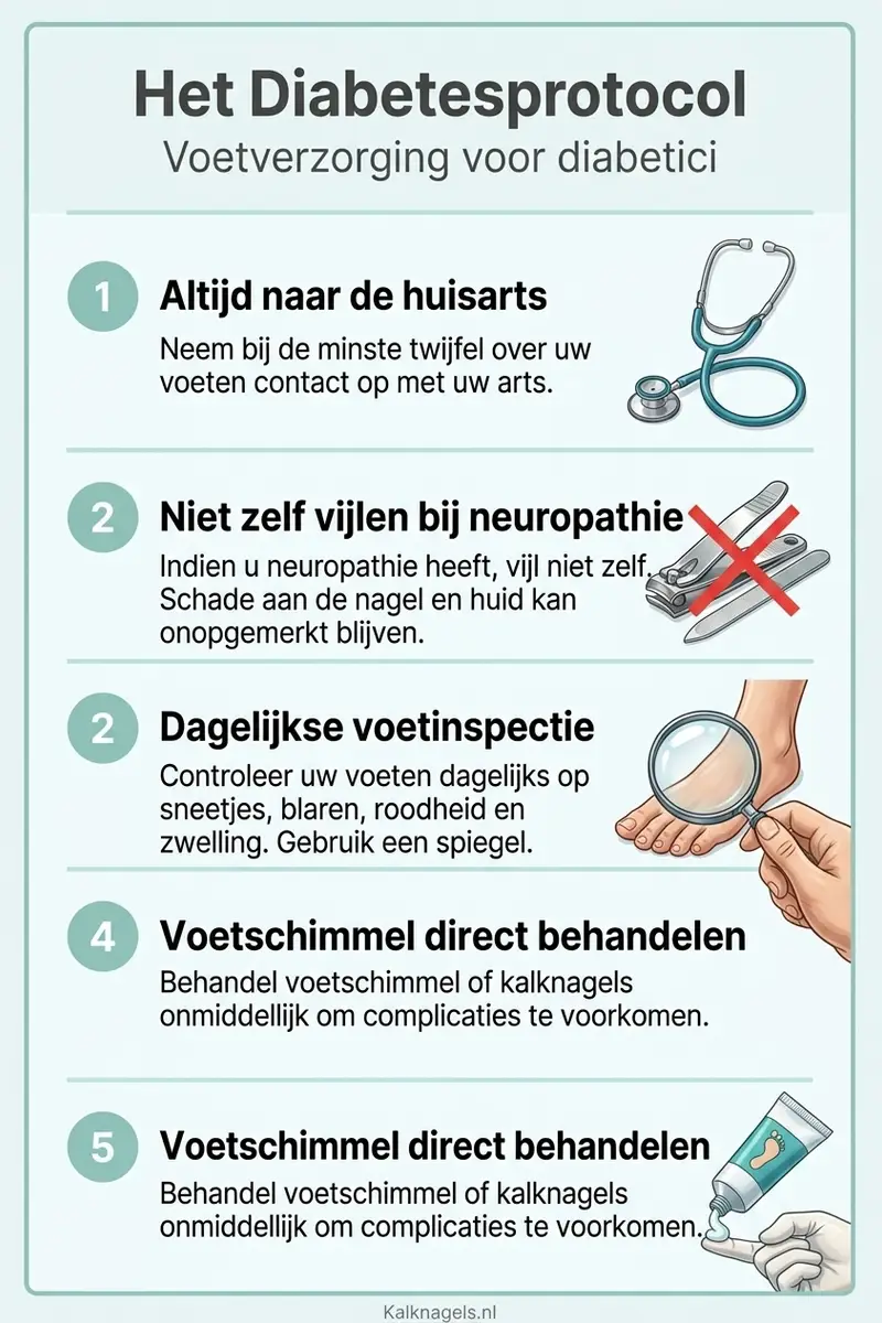 Bij diabetes is een kalknagel geen kwestie van "zelf oplossen met nagellak". Ga naar de huisarts voor een beoordeling. De huisarts controleert of het om een schimmelinfectie gaat, beoordeelt de conditie van je voeten en beslist of behandeling nodig is.