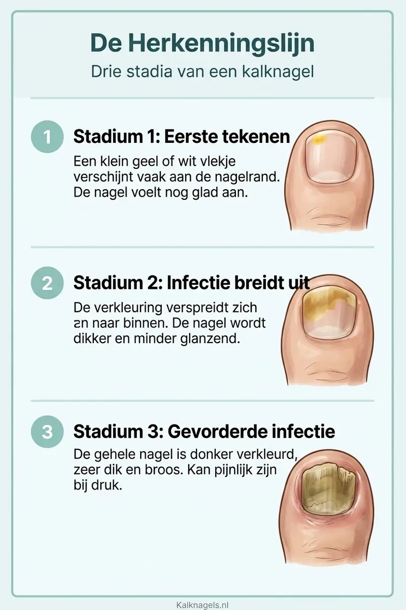 Je nagel ziet er anders uit dan normaal en je wilt weten: is dit een kalknagel? Bij meer dan de helft van de mensen die ons schrijven begint de onzekerheid met een kleine verkleuring die ze niet kunnen plaatsen (Bron: lezersvragen Kalknagels.nl, 2026). De Herkenningslijn, het visuele vergelijkingsmodel dat we op Kalknagels.nl gebruiken, helpt je stap voor stap bepalen of je nagel kenmerken van een schimmelinfectie vertoont.