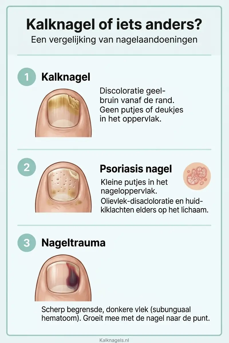 Let op: niet elke verkleurde nagel is een kalknagel. De Herkenningslijn helpt je inschatten of het een kalknagel is, maar zekerheid geeft alleen een nagelkweek bij de huisarts. Drie aandoeningen die op een kalknagel lijken: