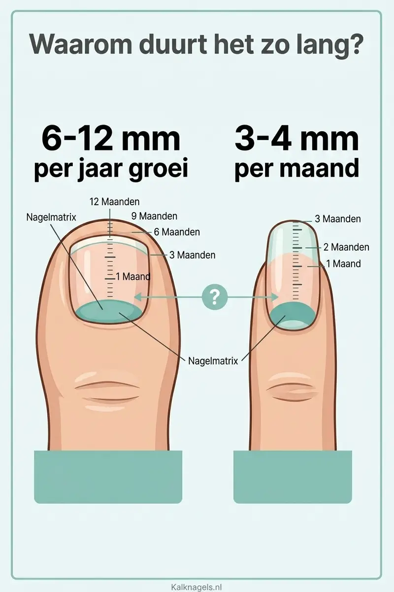 - Leeftijd: ouderen hebben een langzamere nagelgroei. Bij 70-plussers kan volledig herstel 18+ maanden duren.