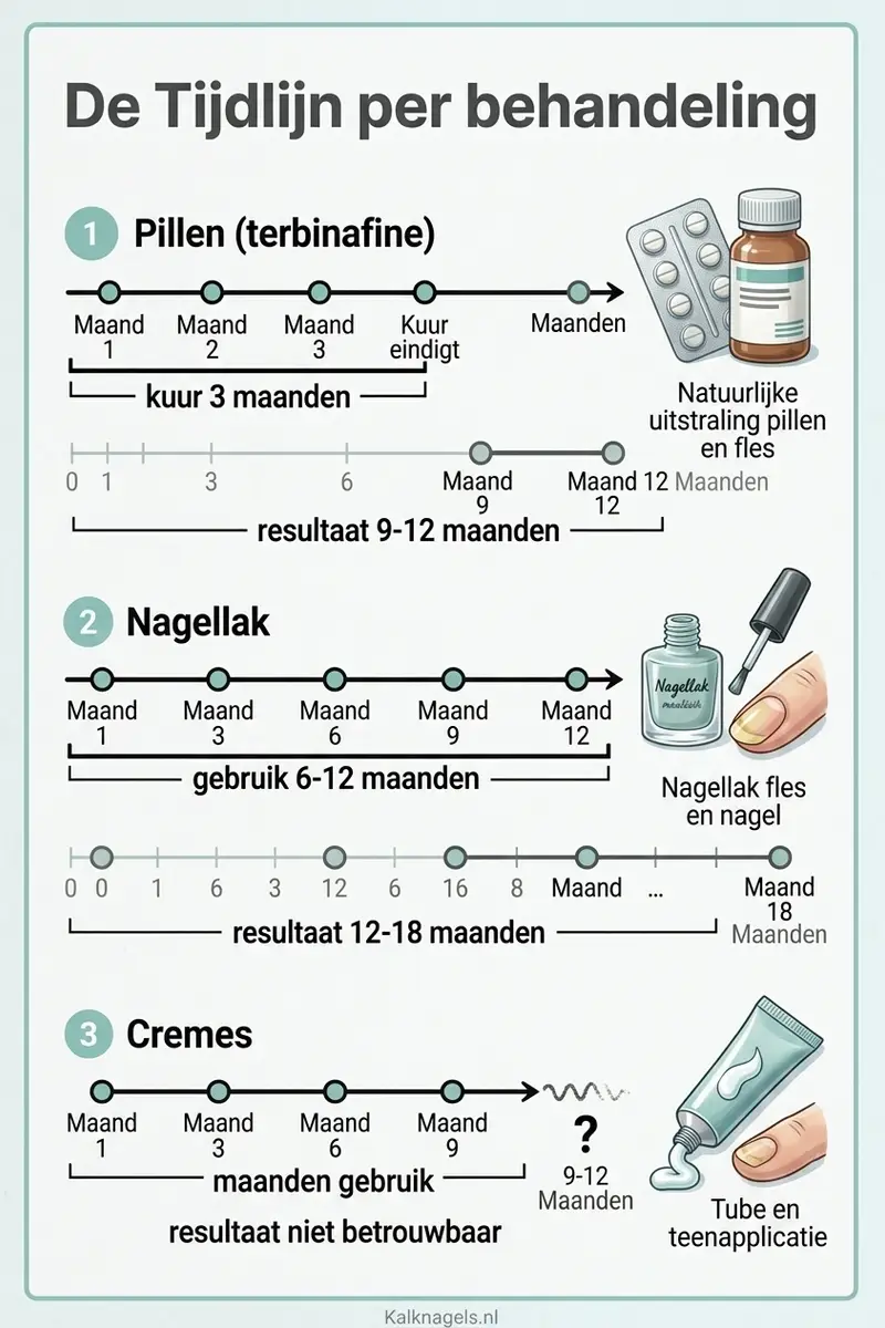 Hoe lang duurt een kalknagelbehandeling? Pillen 3 maanden, nagellak 6-12 maanden. Lees de tijdlijn per behandeling en wanneer je resultaat kunt verwachten.