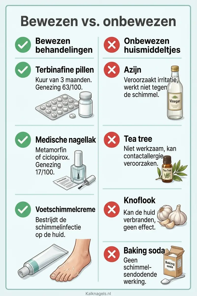 Dat betekent niet dat alle huismiddeltjes per definitie niet werken. Het betekent dat we het niet weten, omdat het bewijs ontbreekt. In de geneeskunde geldt: bewijs van afwezigheid is niet hetzelfde als afwezigheid van bewijs. Maar bij een aandoening waarvoor bewezen behandelingen beschikbaar zijn (terbinafine: 63 van 100 genezen), is het niet logisch om te kiezen voor een middel waarvan de werking onbekend is.