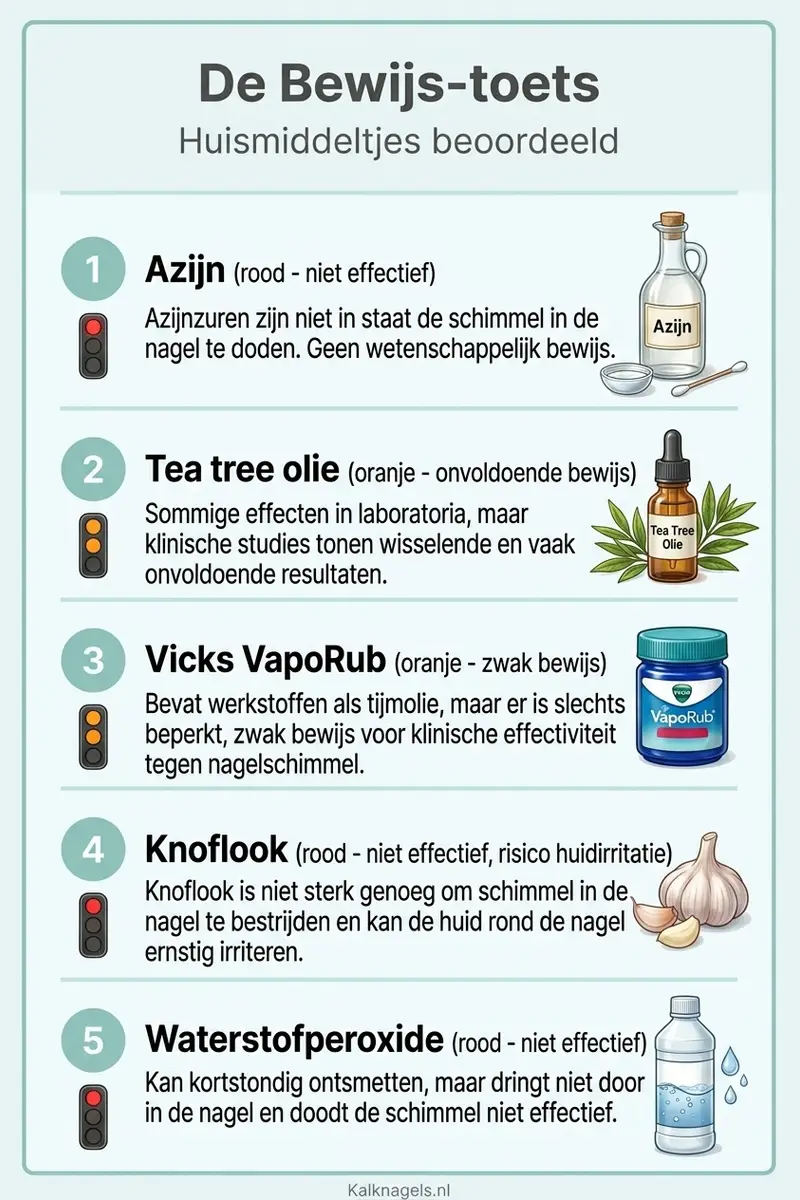 Je hebt een kalknagel en zoekt op internet naar oplossingen. Binnen een paar klikken vind je tientallen websites die azijn, tea tree olie of knoflook aanprijzen als remedie. De Bewijs-toets, het beoordelingsmodel dat we op Kalknagels.nl gebruiken, legt elk huismiddeltje langs drie vragen: werkt het in het lab, werkt het op een echte nagel, en zegt de NHG-Standaard er iets over? Het antwoord is teleurstellend maar eerlijk.
