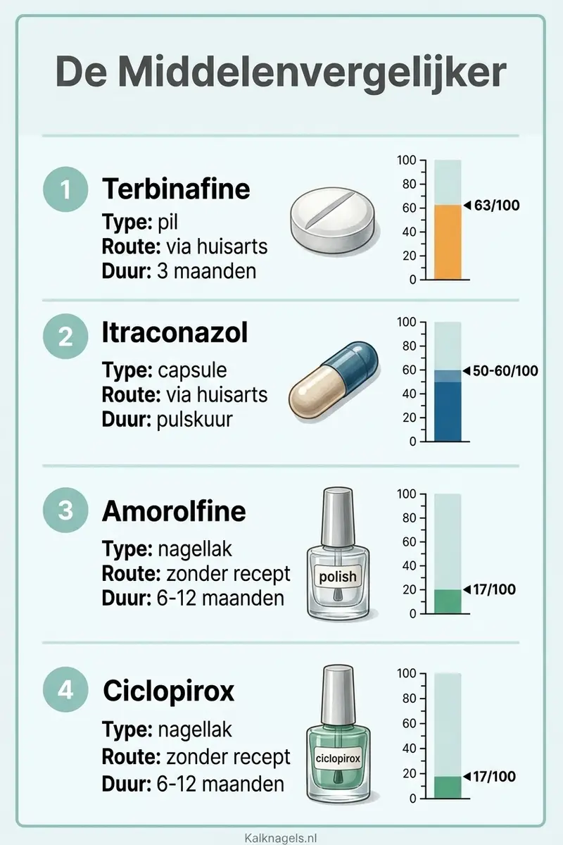 Je huisarts heeft pillen of nagellak voorgesteld tegen je kalknagel, maar welk middel is het beste? De Middelenvergelijker, het beoordelingsmodel dat we op Kalknagels.nl hanteren, vergelijkt alle beschikbare medicijnen op vijf punten: werkingsmechanisme, effectiviteit, behandelduur, bijwerkingen en geschiktheid. Het verschil tussen de middelen is groot en de keuze hangt af van jouw situatie.