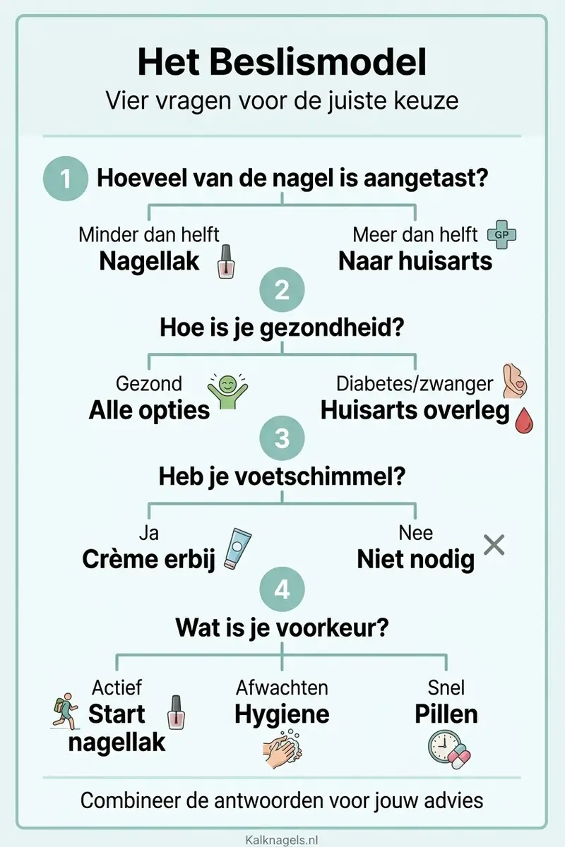 Op Kalknagels.nl gebruiken we Het Beslismodel als keuzehulp voor kalknagelproducten. Het Beslismodel stelt vier vragen die samen bepalen welk product bij jouw situatie past. De vragen gaan over de ernst van de infectie, je gezondheid, de aanwezigheid van voetschimmel en je persoonlijke voorkeur.