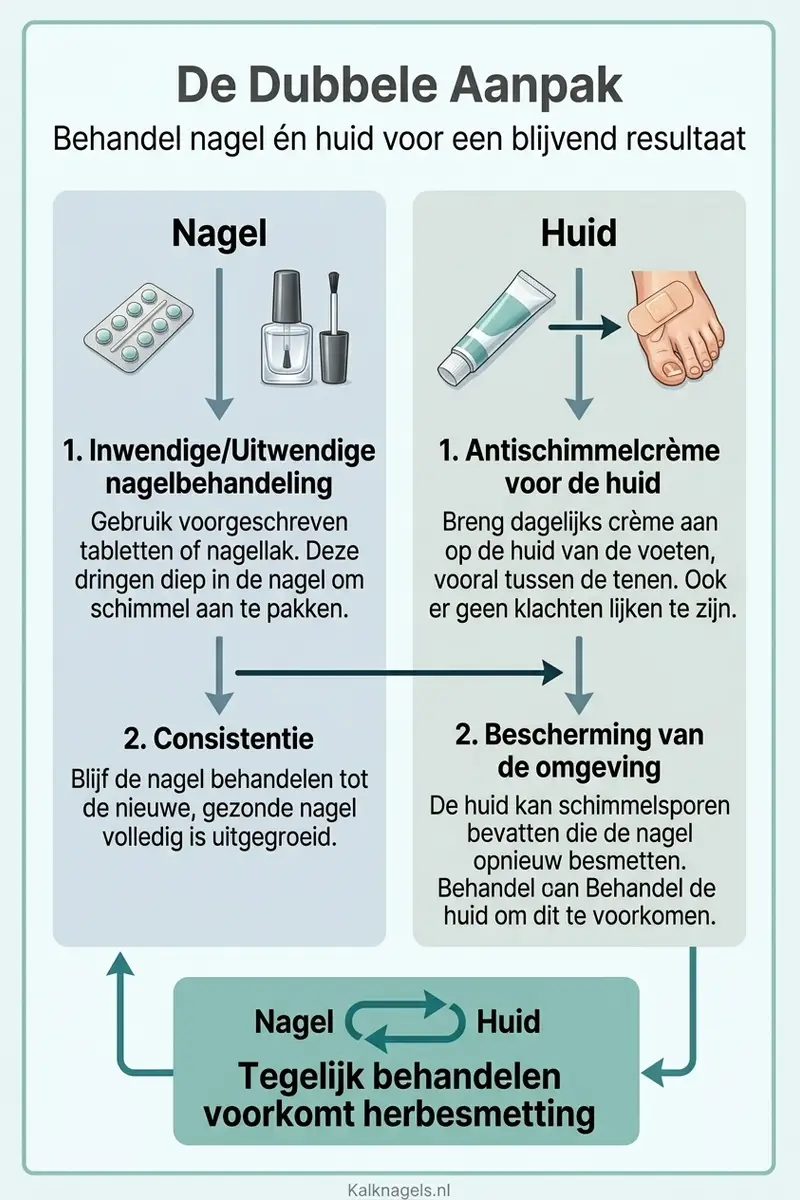 Je behandelt je kalknagel met pillen of nagellak, maar de schimmel komt steeds terug. De reden is vaak niet de nagel zelf maar de huid eronder en eromheen. De Dubbele Aanpak, het behandelprincipe dat we op Kalknagels.nl hanteren, laat zien dat voetschimmel en kalknagels twee verschijningsvormen zijn van dezelfde infectie. Behandel je de ene niet, dan komt de andere terug.
